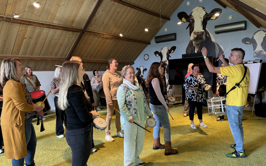 Met Braziliaanse trommels de stress van je afslaan – letterlijk! Ivo liet de groep ervaren hoe ritme je moeiteloos in het moment trekt, je hoofd leegmaakt en je stemming een enorme boost geeft. Binnen een paar minuten ontstond er een swingend samenspel waarin lachen, bewegen en loslaten centraal stonden. Het was onmogelijk om níet met een glimlach de zaal uit te lopen.